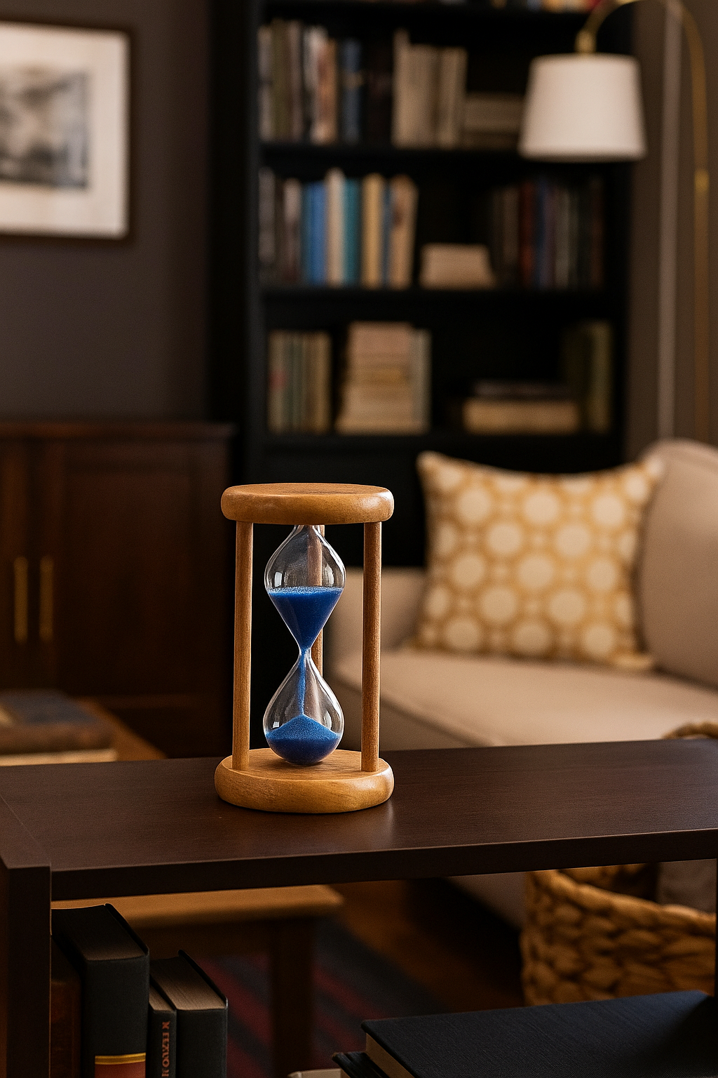 Ampulheta Decorativa 14 cm – Vidro com Base de Madeira e Areia Colorida.