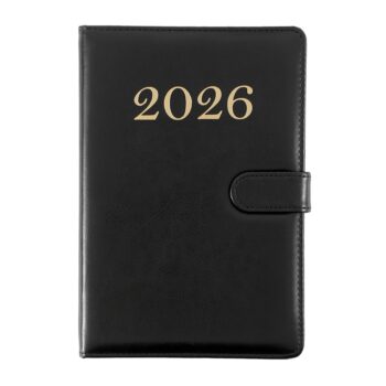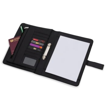 Sua capa conta com uma calculadora solar de 8 dígitos acoplada, perfeita para facilitar cálculos rápidos durante reuniões, estudos ou tarefas diárias. Acompanha uma caneta ecológica em papelão com ponteira plástica preta, fixada por suporte elástico lateral.