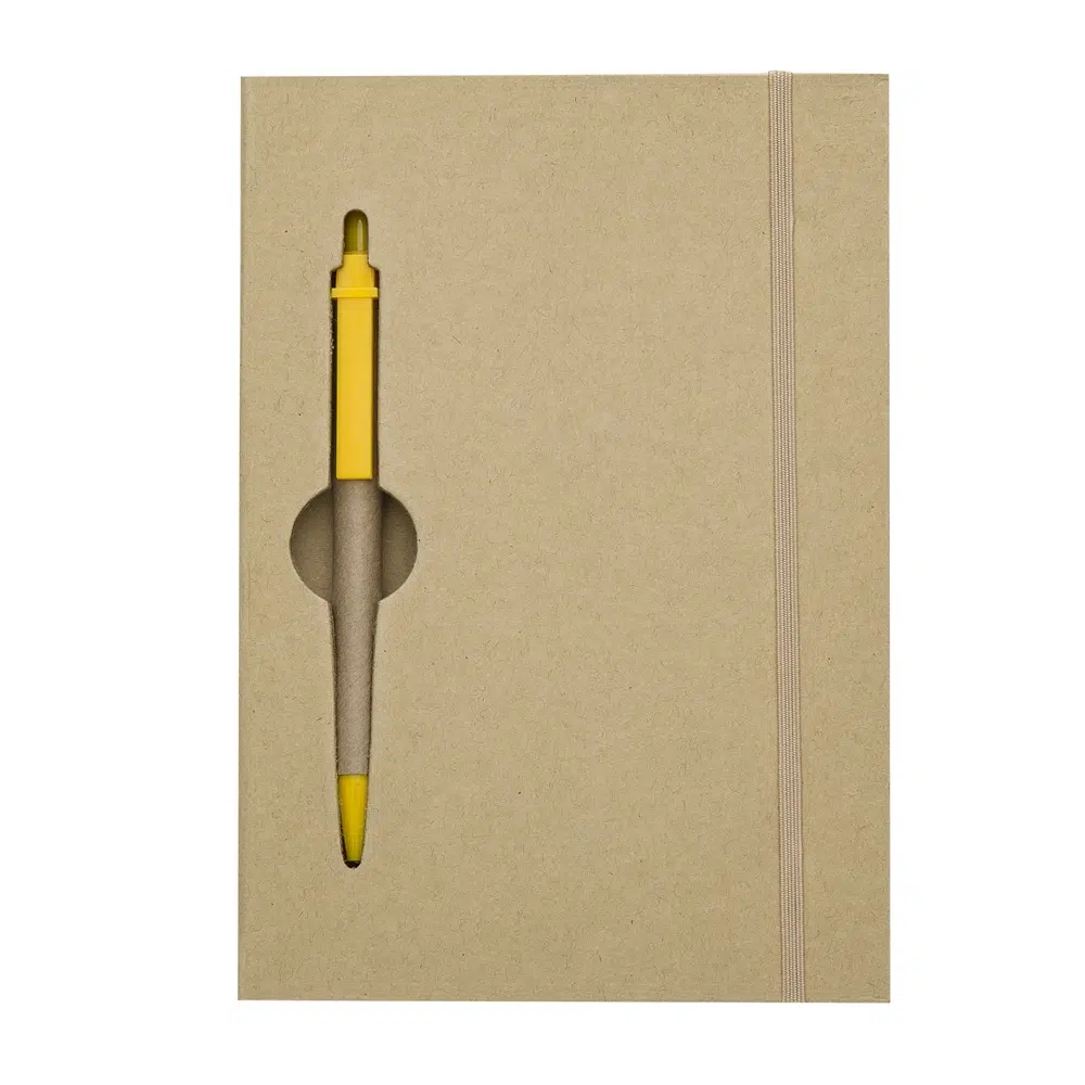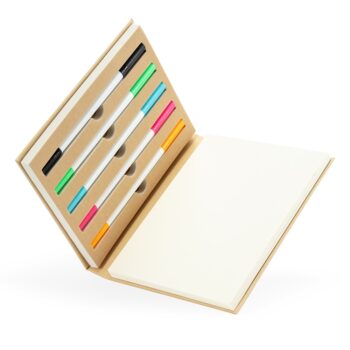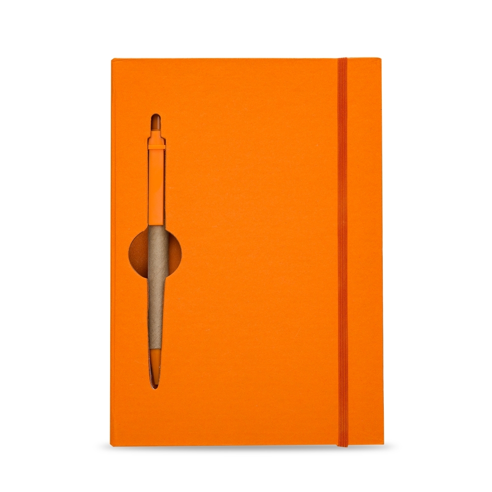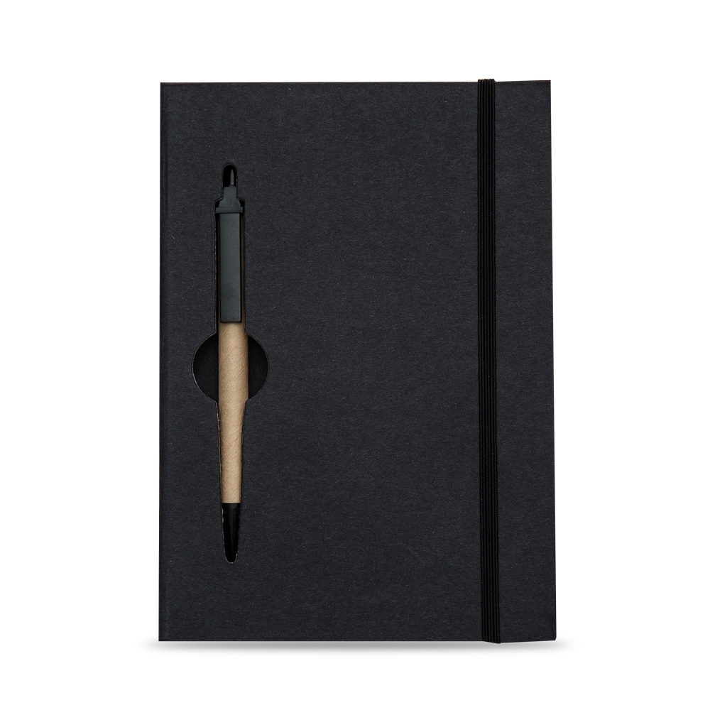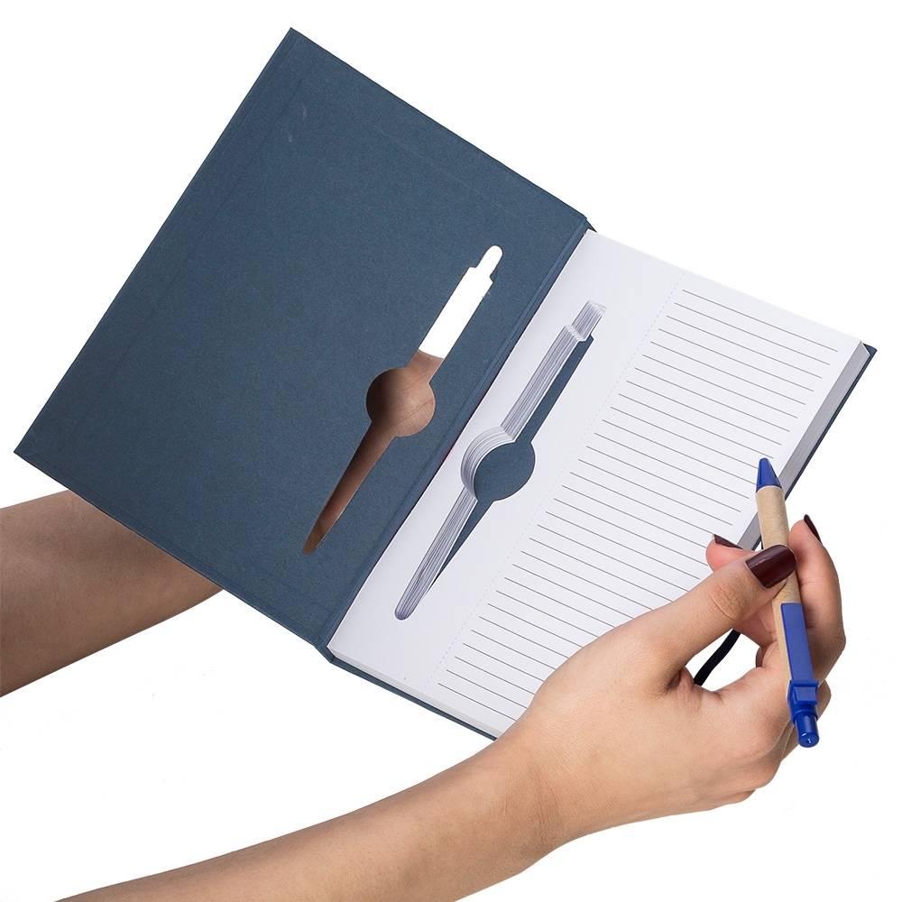Este bloco de anotações ecológico possui capa rígida com acabamento natural e um design exclusivo com vazados na capa e no miolo, que funcionam como suporte para a caneta – um detalhe funcional e diferenciado.