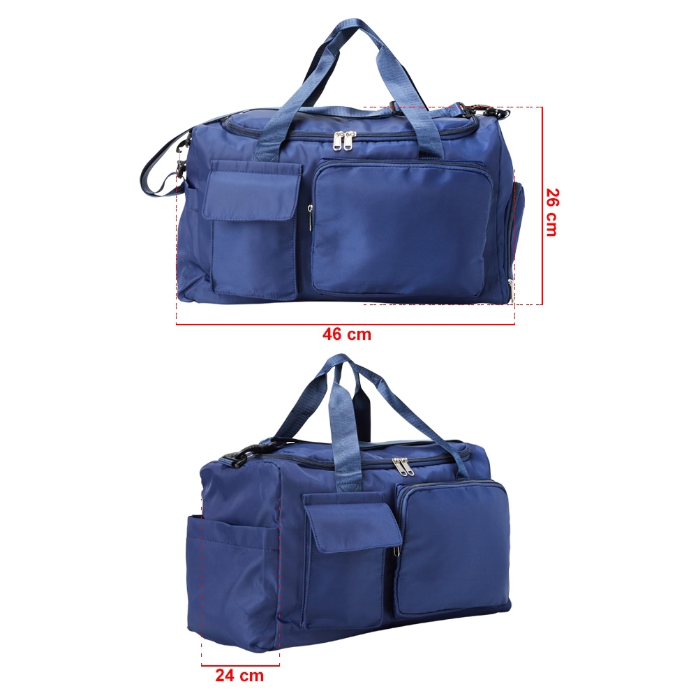 Bolsa de viagem 28 litros em poliéster de impacto impermeável com cinco compartimentos, sendo um deles exclusivos para tênis. Compartimento principal com bolso de zíper exclusivo para itens molhados. Com bolso lateral e duas alças de mãos, a bolsa contém alça transversal removível e bolso para engate em malas de viagem.