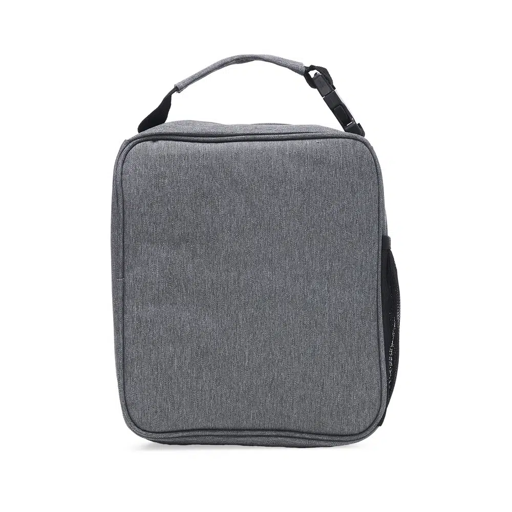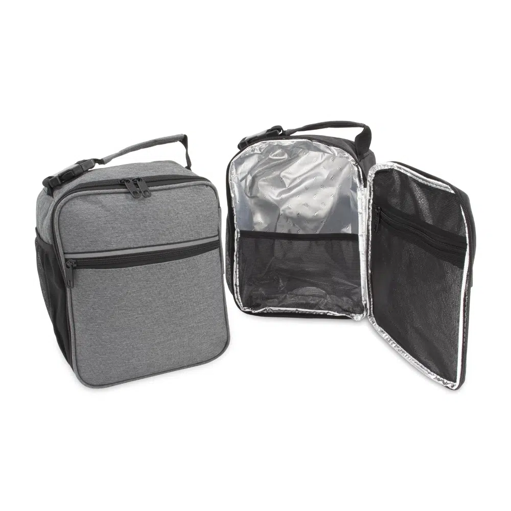 Bolsa térmica de nylon com dois compartimentos, capacidade de 6 litros. Com bolso telado e tela média de proteção interna, a bolsa possui uma faixa frontal refletiva, bolso lateral telado e alça de mão com fivela de encaixe.