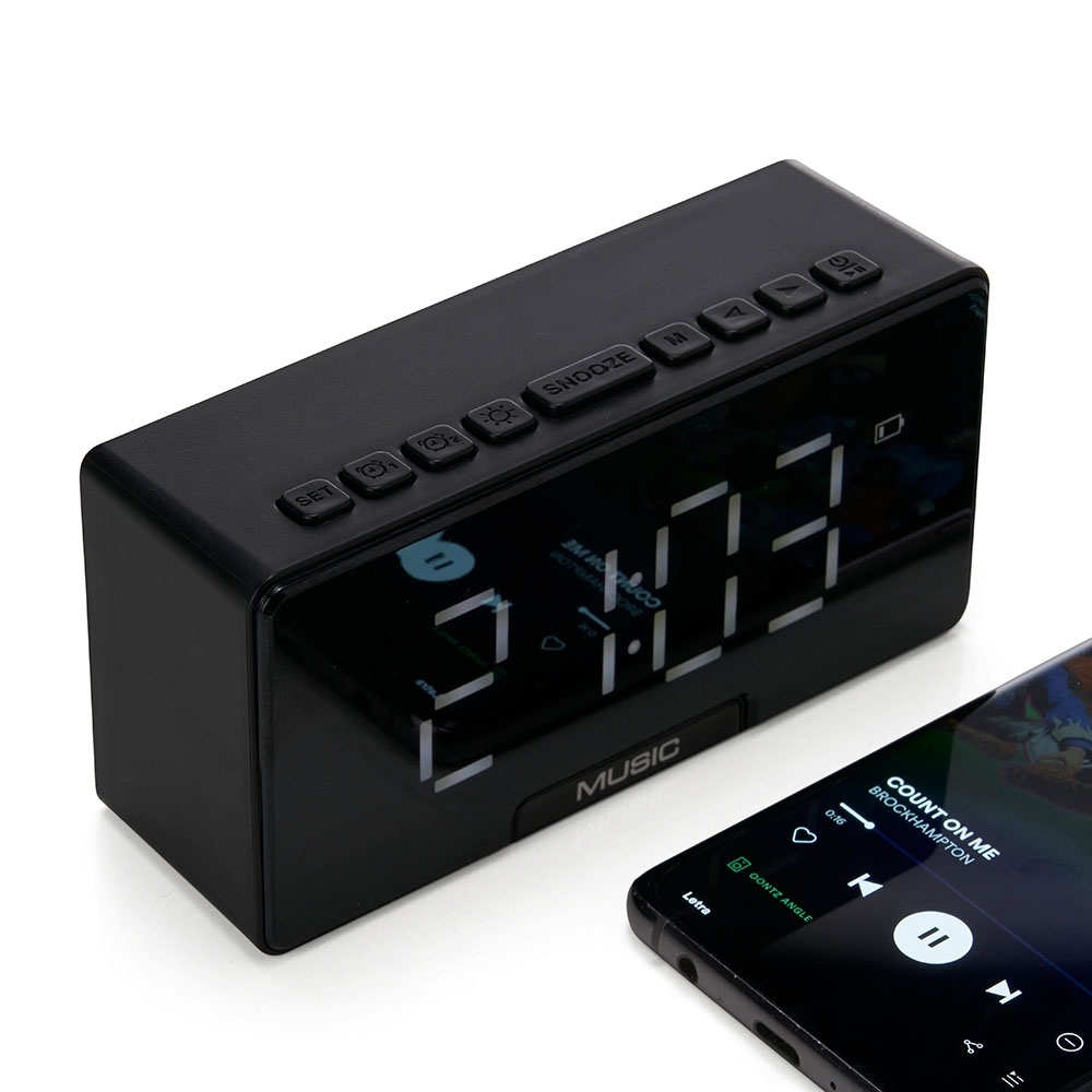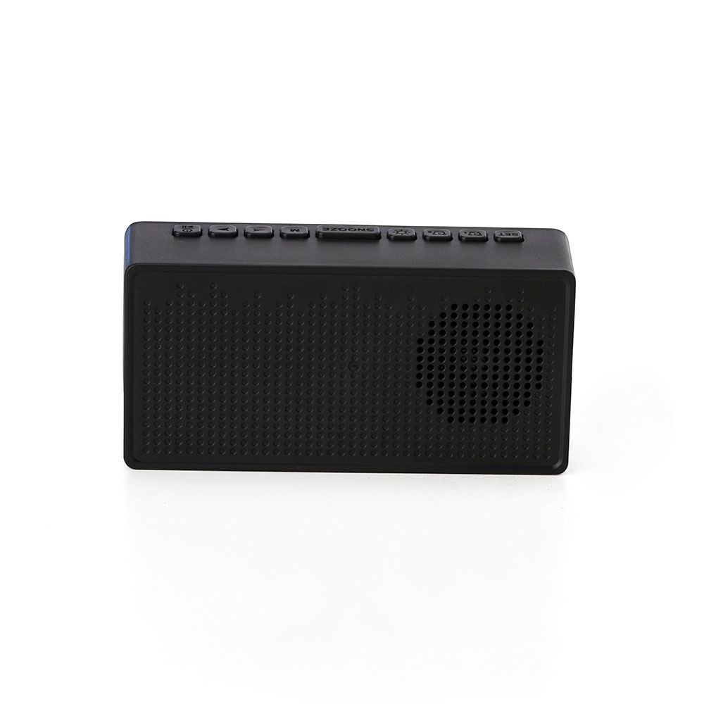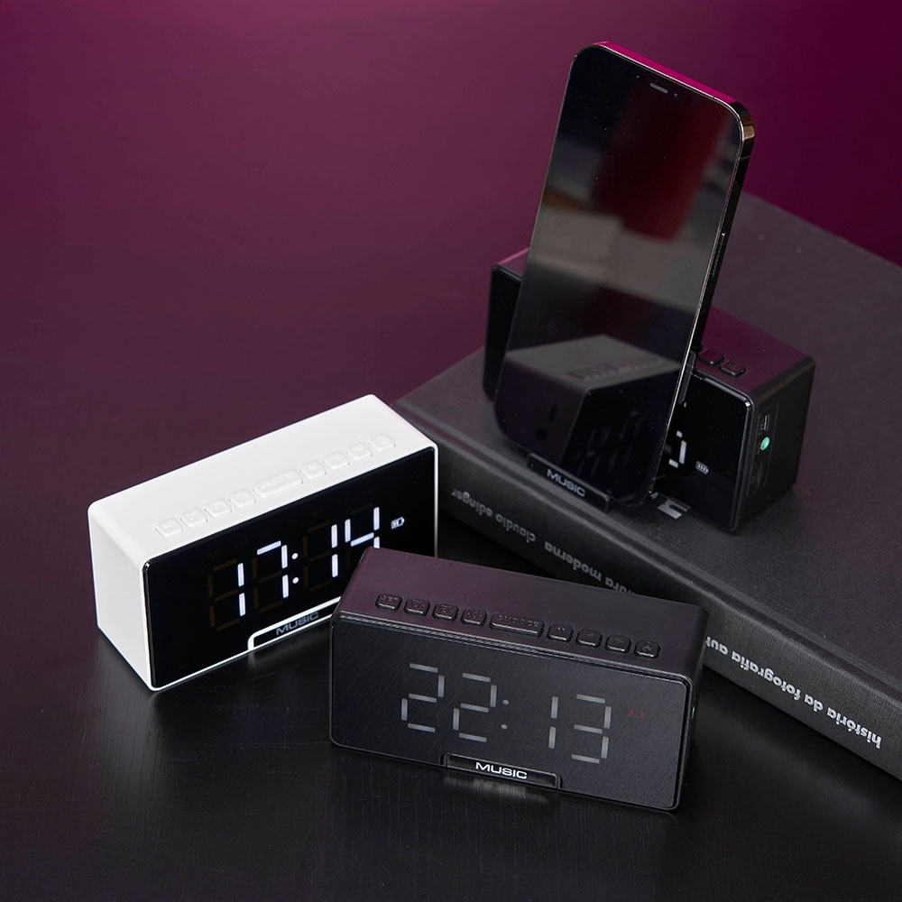 Caixa de som multimídia com relógio despertador e suporte para celular. Produzida em plástico e com borrachas antiderrapantes na área inferior, a caixa de som tem a área frontal com display de LED, além de um compartimento com suporte para celular – uma espécie de “gaveta” aonde é exibido (MUSIC), basta puxá-la ter acesso ao compartimento. A caixa de som executa nos modos bluetooth, cartão TF-microSD e entrada auxiliar P2. Acompanha cabo USB e manual em inglês.