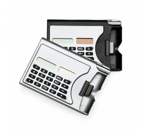 Calculadora plástica de 8 dígitos com porta cartão lateral. Acompanha caneta plástica prata com clip de metal na parte superior.