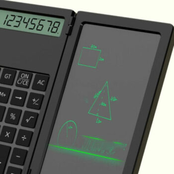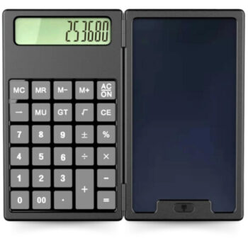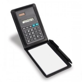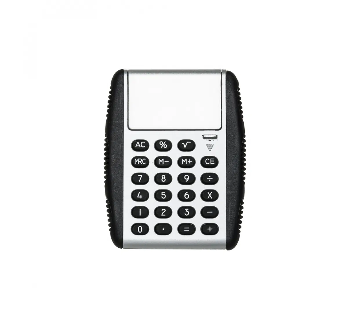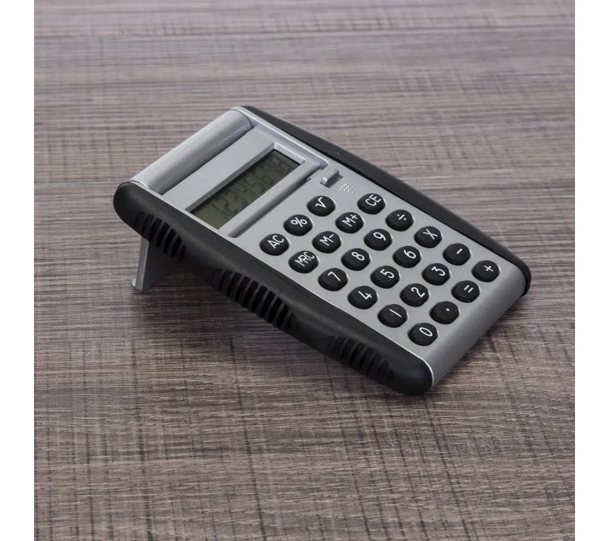 Calculadora plástica de 8 dígitos com bordas emborrachadas em relevo. Possui compartimento flexível, basta puxar “botão” para baixo que a tampa protetora irá levantar e servirá de apoio, acompanha uma bateria AG10.