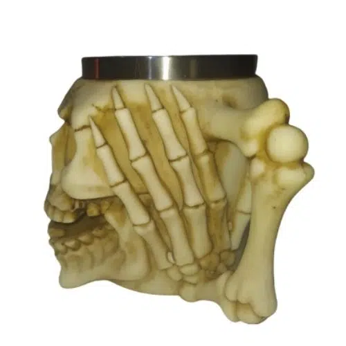 Em até 2x de R$27,50 sem juros À vistaR$49,50no Pix Caneca caveira em metal e resina 450 ml 15×12 cm.