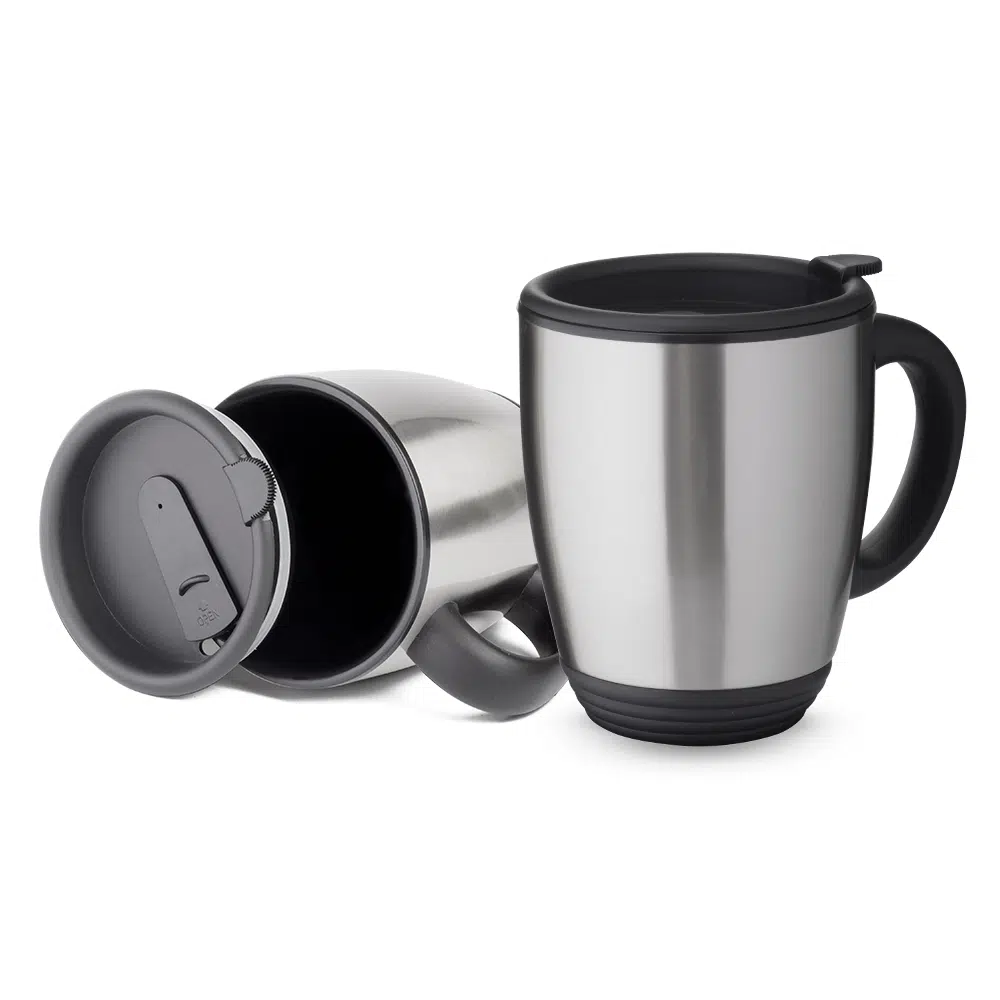 Caneca em inox de 470ml. Possui tampa com vedação, bocal com trava de segurança e pegador de plástico.