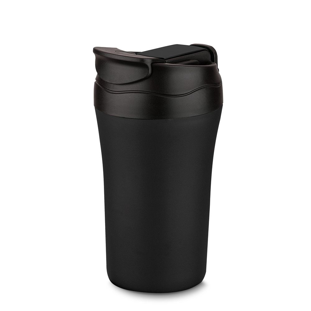 Copo térmico com parede dupla, saída de líquido tanto por sucção (canudo) como por bico, com base revestida de borracha antiderrapante 300 ml.