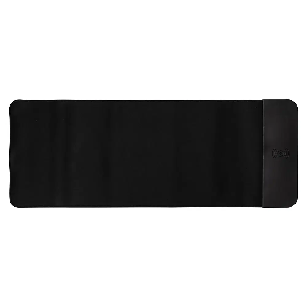 Desk Pad carregador por indução. O Produto pode ser colocado sobre a mesa com espaço suficiente para seu mouse e teclado, ainda oferecendo uma estação de carregamento wireless em sua parte lateral. O produto acompanha cabo USB.