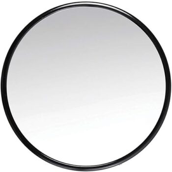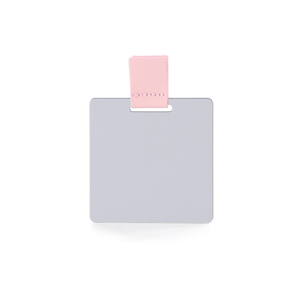 Espelho inquebrável de aço inoxidável ultra fino com verso escovado e alça em couro sintético. Acompanha estojo de couro sintético.