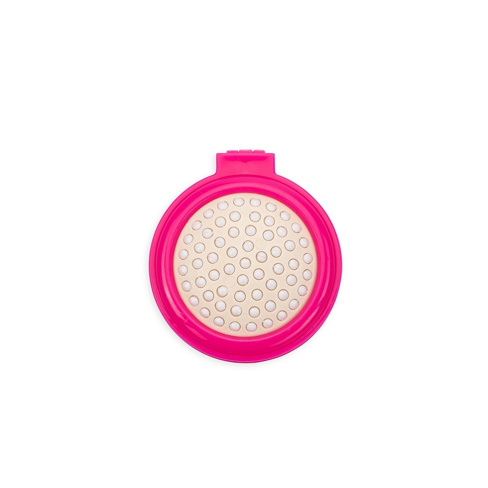 Escova com espelho redonda em plástico resistente. Parte superior plana e parte inferior emborracha com relevo, estando aberta a peça basta empurrar a parte emborrachada(lado de fora) para poder utilizar a escova.