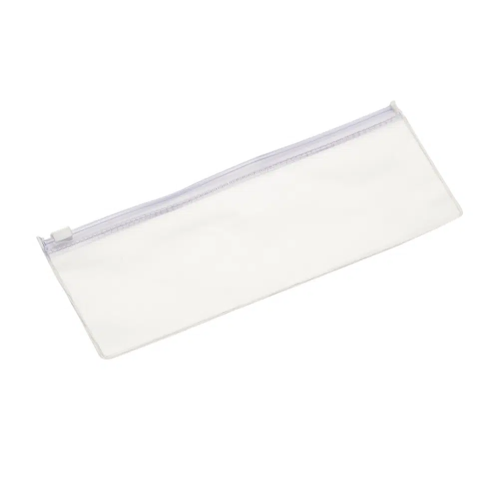 Estojo plástico zip zap, basta movimentar suporte branco para os lados para abrir/fechar.