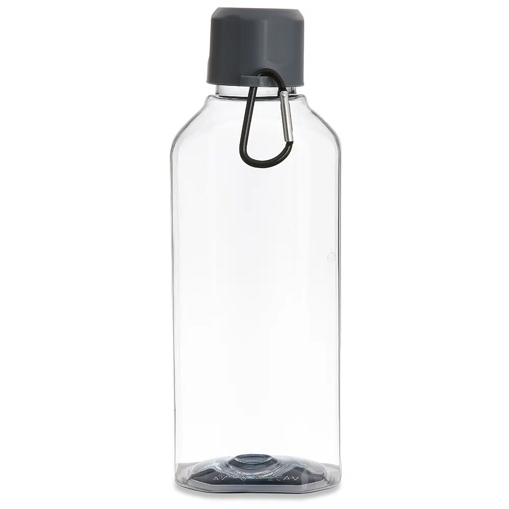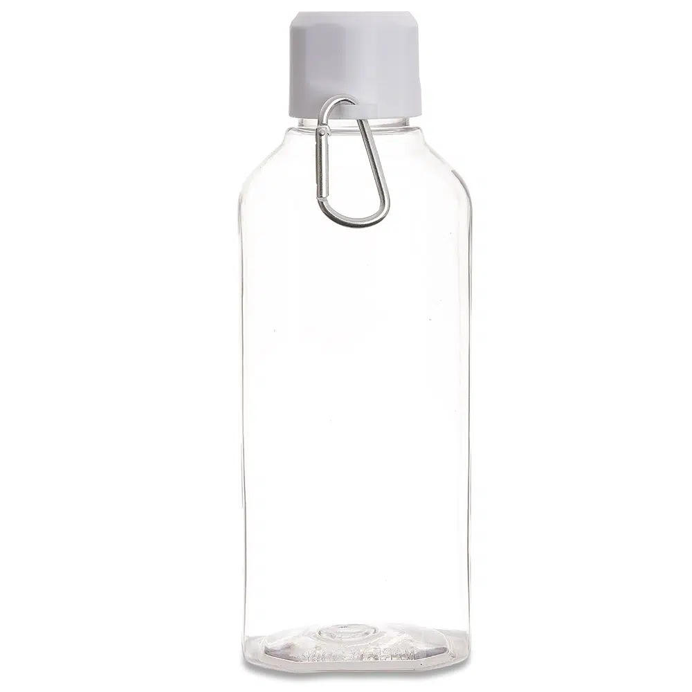Garrafa plástica 730ml com tampa rosqueável e mosquetão colorido.
