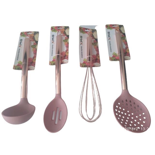 Lindo jogo para sua cozinha, feito de Silicone Rosa com cabo de Inox Rose Gold, composto por: