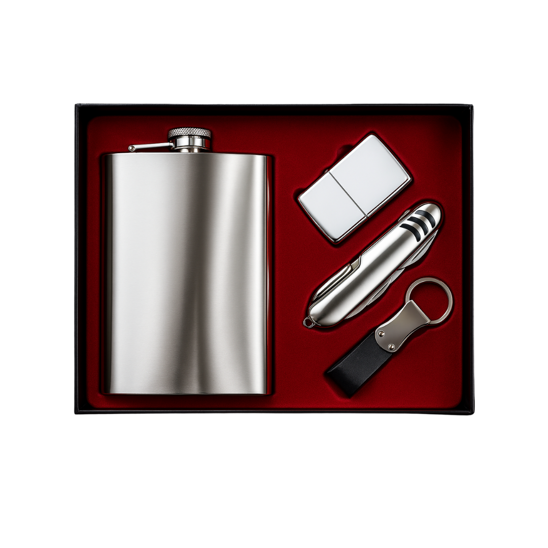 • Kit completo: cantil, isqueiro, canivete e chaveiro – tudo em um só conjunto.