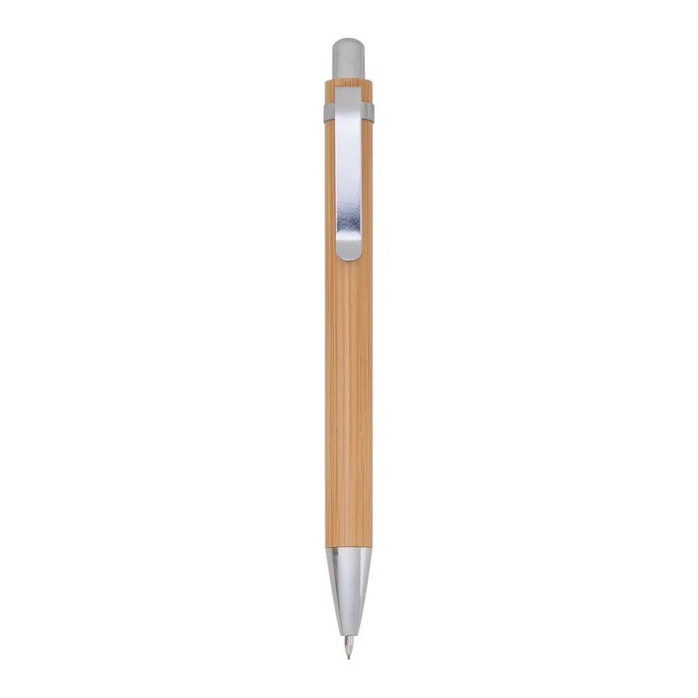 Kit ecológico caneta e lapiseira em bambu com estojo de papelão. Carga esferográfica azul. Acionamento por clique.