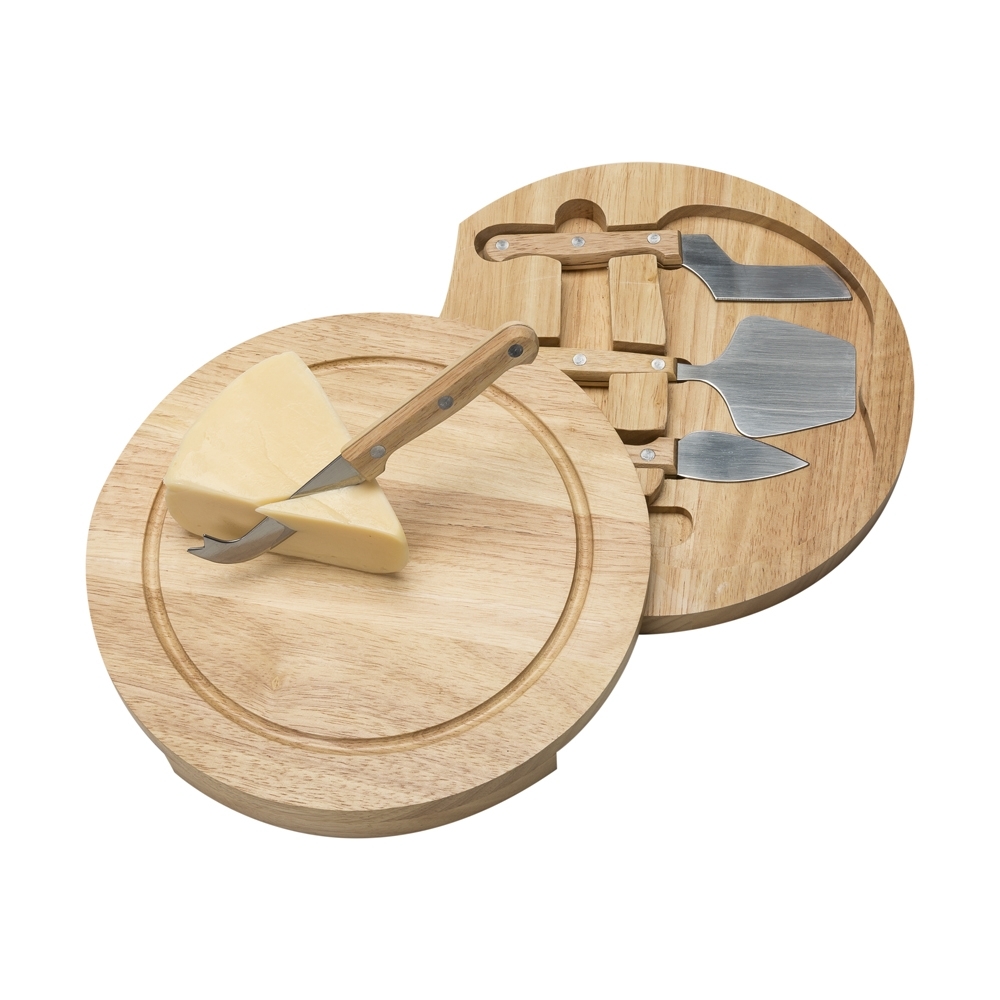 Kit queijo 5 peças, contém: tábua de bambu com gaveta para acomodação dos utensílios, faca com ponta, faca reta, garfo e espátula.