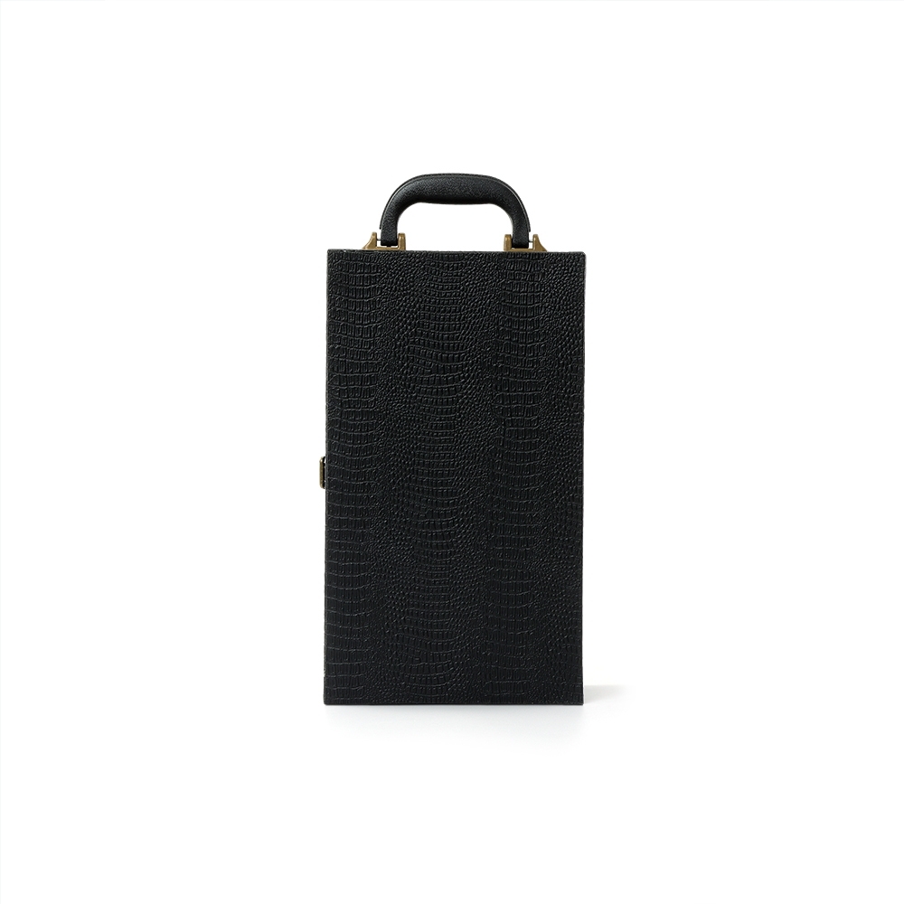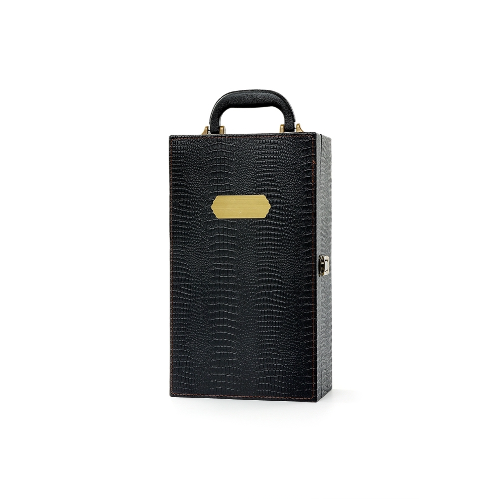 Kit vinho 4 peças em maleta de couro sintético texturizada. Contém saca-rolhas metálico, bico condutor com tampa, cortador de lacre e wine collar. Maleta com alça, trava de segurança e plaquinha plástica fixa. Área interna revestida de veludo com suportes de nylon com velcro e duas repartições para garrafas.