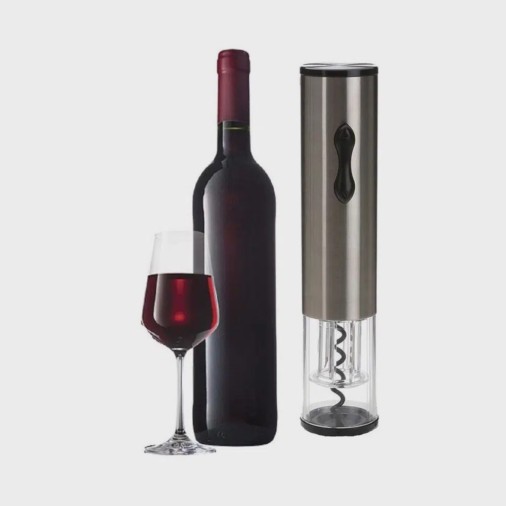 Kit vinho com 5 peças em estojo de papelão, revestido parte interna com espuma. Possui: tampa de bico, wine collar, termômetro, cortador de lacre e saca-rolha.