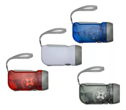 Lanterna plástica com 3 leds, pressionando o “gatilho” gera energia para alimentar a lanterna dínamo. Possui botão para ligar/desligar lanterna, botão para travar gatilho e acompanha cordão.