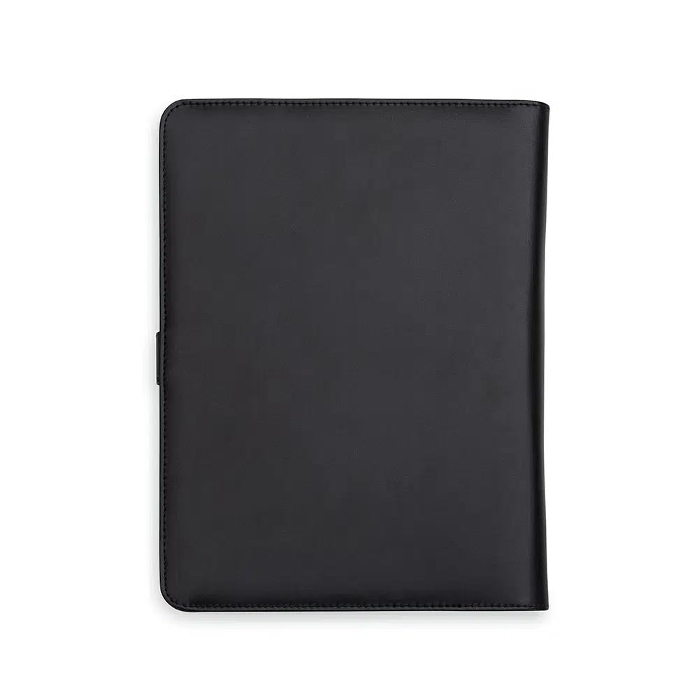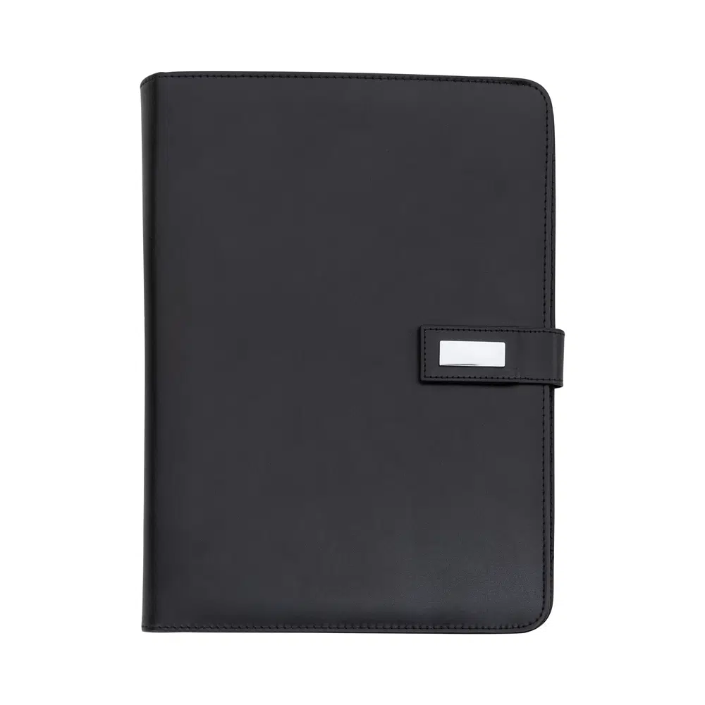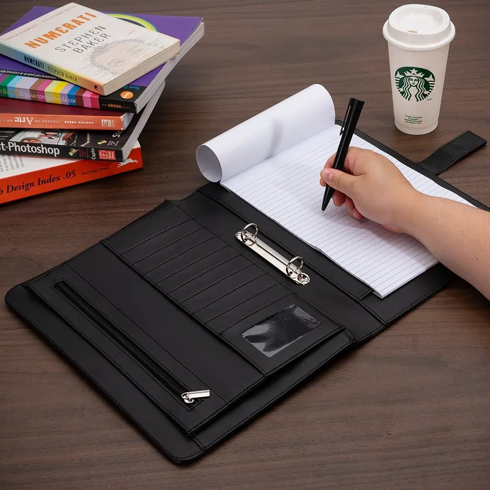 Pasta convenção com fecho imantado e plaquinha personalizável. Produzido em couro sintético, a pasta contém bolso lateral na contracapa e bolso com fechamento em zíper, além divisórias para cartões e/ou documentos com bolso lateral. Possui acesso para fichário de duas argolas e compartimento para bloco de folhas com aproximadamente 20 folhas brancas com pauta.
