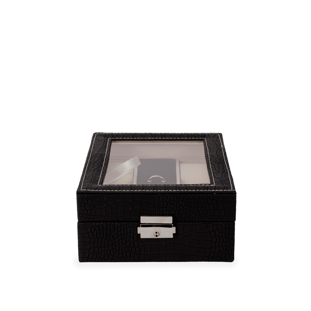 Porta-relógios com acabamento em couro sintético. Conta com revestimento interno em veludo e seis compartimentos: quatro com almofadas removíveis, um para objetos menores e outro almofadado com ranhuras. Possui tampa com visor em vidro e trava de segurança. Acompanha chave para fechamento do estojo.