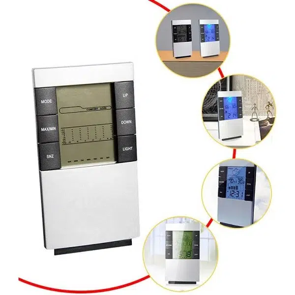 Relógio Despertador com Termômetro, Higrômetro, Calendário e Previsão do tempo. Mostra a hora, temperatura e umidade ao mesmo tempo. Registra a temperatura/umidade máxima e mínima.